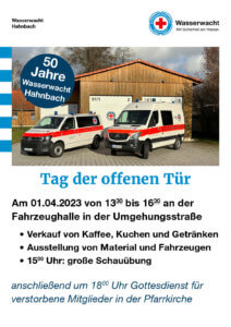 Anlässlich des Gründungstags der Wasserwach Hahnbach am 01.04.1973 veranstalten wir einen Tag der offenen Tür an der Fahrzeughalle in der Umgehungsstraße
